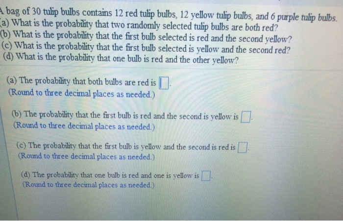 Solved Planting Tulips A Bag Of 30 Tulip Bulbs Purchased From A Nursery Contains 12 Red Tulip Bulbs 10 Yellow Tulip Bulbs And 8 Purple Tulip Bulbs Use A Tree Diagram Like The